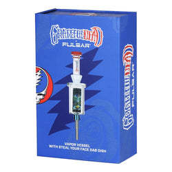 Get cosmic with the Pulsar x Grateful Dead UFO Jam Dab Straw Kit — a celestial blend of psychedelic art and smooth dab performance. This inside print vapor vessel is made from durable borosilicate glass, showcasing the UFO Jam design from Dave’s Picks Vol. 23. The artwork features eight skeletons gathered around a campfire, representing the Grateful Dead’s 1978 touring lineup, as they jam under a starry sky while a spaceship hovers above. The vibrant design is sealed within the glass to preserve its detail and color, no matter how many times you sesh.