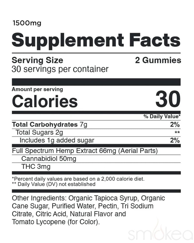Full spectrum hemp extract, organic tapioca syrup, organic cane sugar, purified water, pectin, tri sodium citrate, citric acid, tomato lycopene, natural flavor.