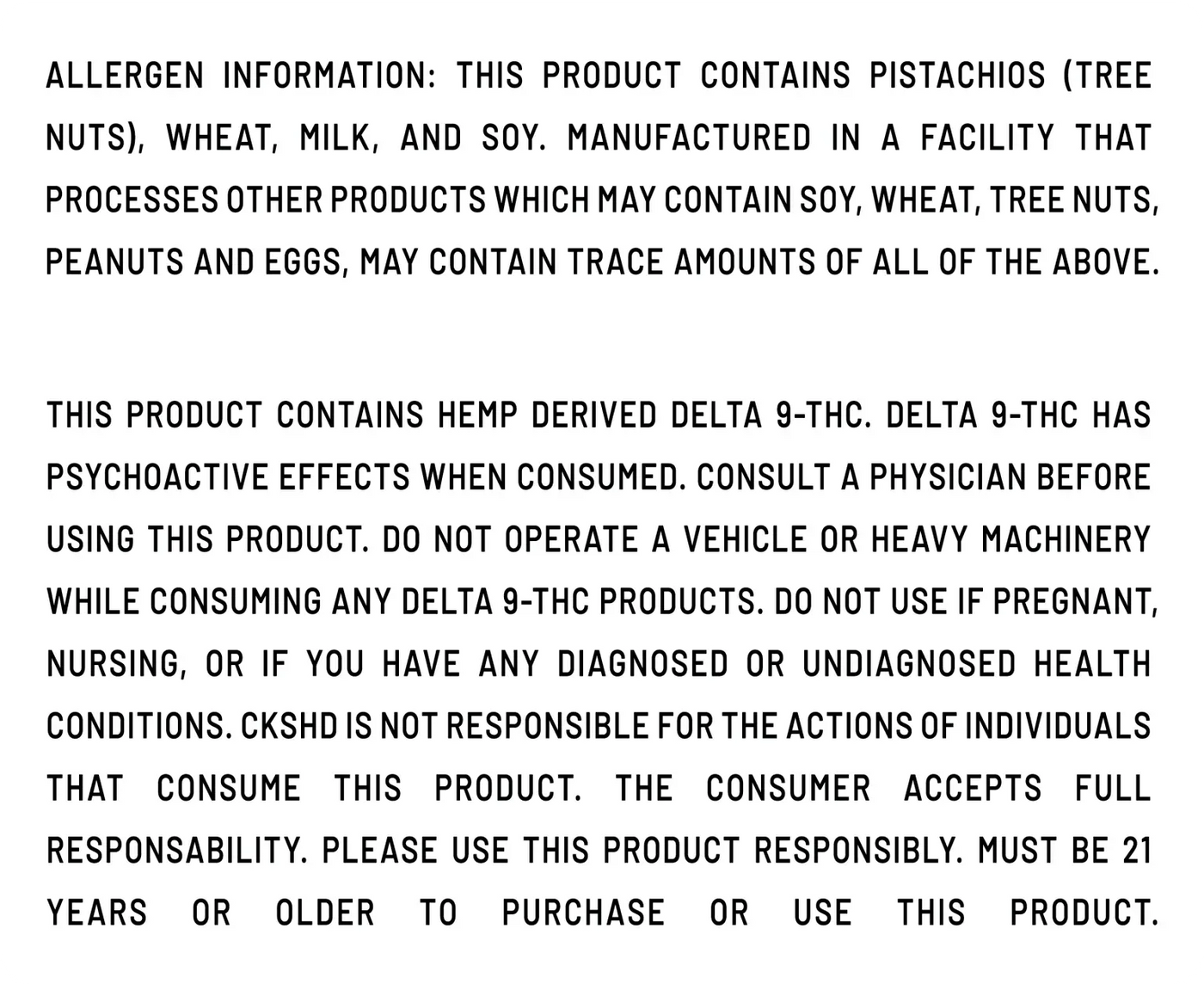 WARNING: Keep out of reach of children. Consult your healthcare provider before taking if you are pregnant, nursing or have any medical concerns. Do not operate heavy machinery after use. Do not take if allergic to hemp, THCP or related products. Product & statement has not been evaluated by the Food & Drug Administration. This product is not intended to diagnose, treat, cure, or prevent any disease. Store in a cool and dry environment. Underage Sale Prohibited.