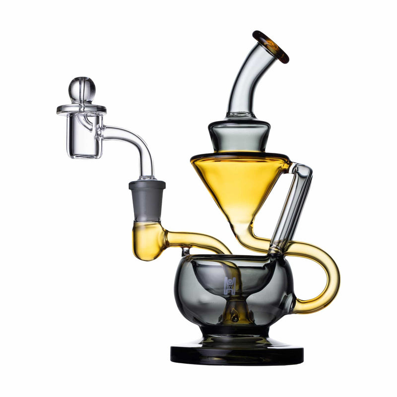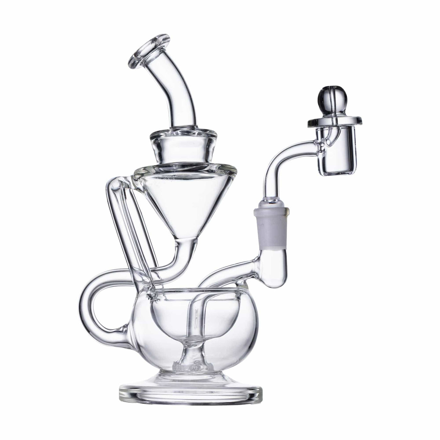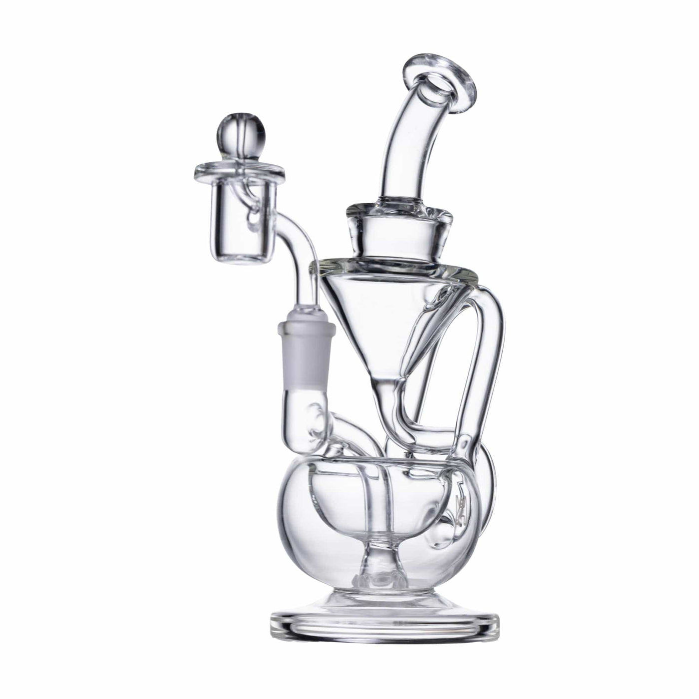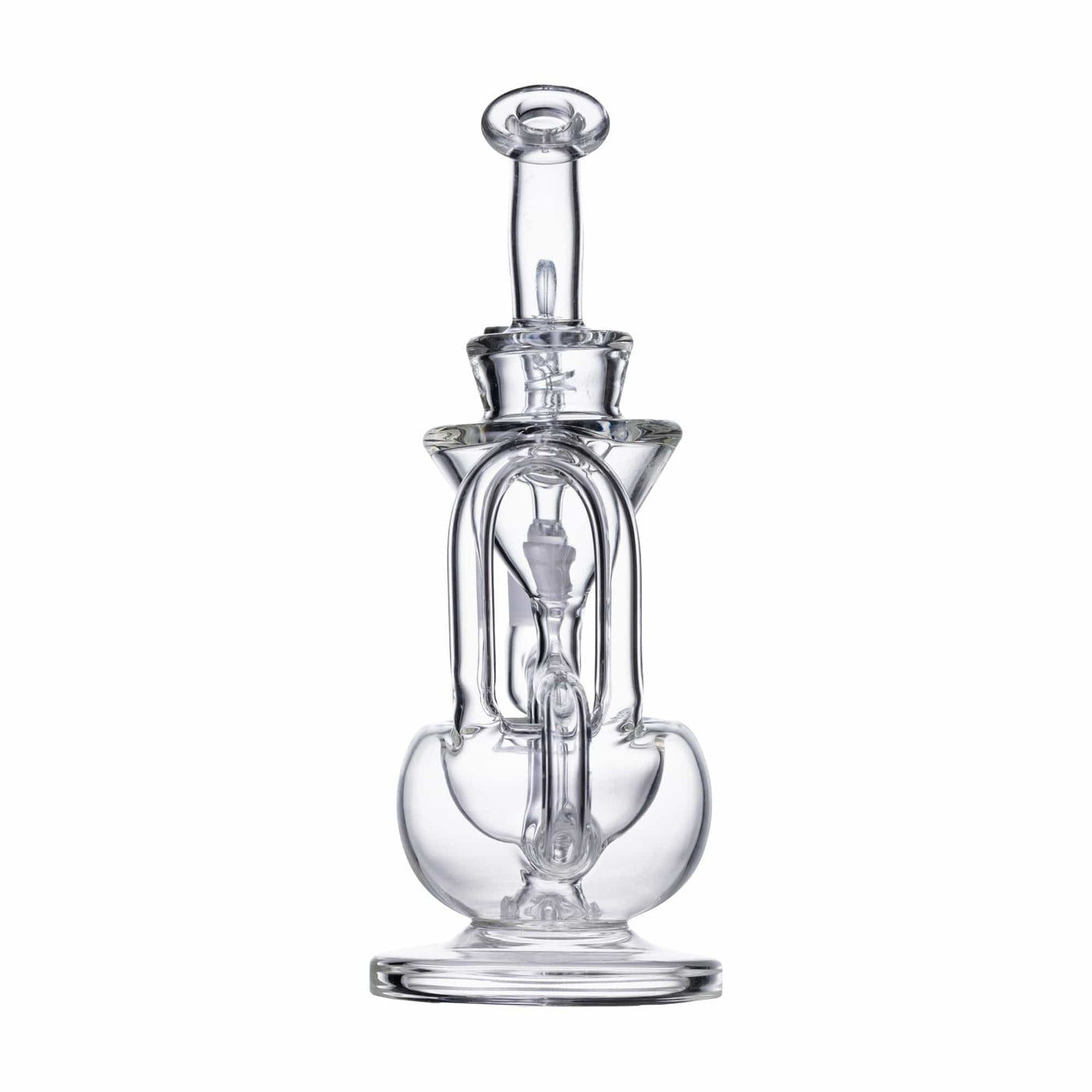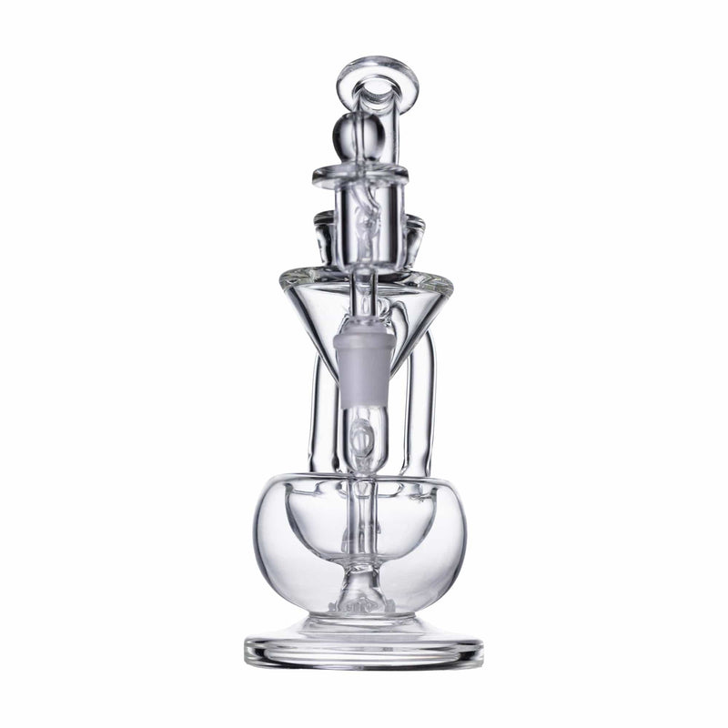 At 8 inches tall with a sturdy 3.1-inch base, this rig is the perfect balance between tabletop presence and daily usability. The double uptake recycler keeps water circulating continuously, cooling vapor efficiently while maintaining a consistent flow. A built-in oil catch helps trap residue before it reaches the bottom of the rig, making cleanup easier and helping preserve the integrity of your glass.