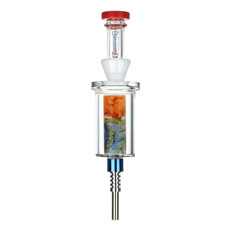 Equipped with a dome percolator, the straw adds light water filtration to cool your vapor on the way in. The threaded tip connection lets you choose between a flavor-packed quartz tip or a hard-hitting titanium tip, giving you full control of your dabbing style. Also included is a matching glass concentrate dish featuring a Stealie decal, bringing that perfect finishing touch. This set hits just as hard as the artwork suggests — ideal for Deadheads and glass collectors alike.